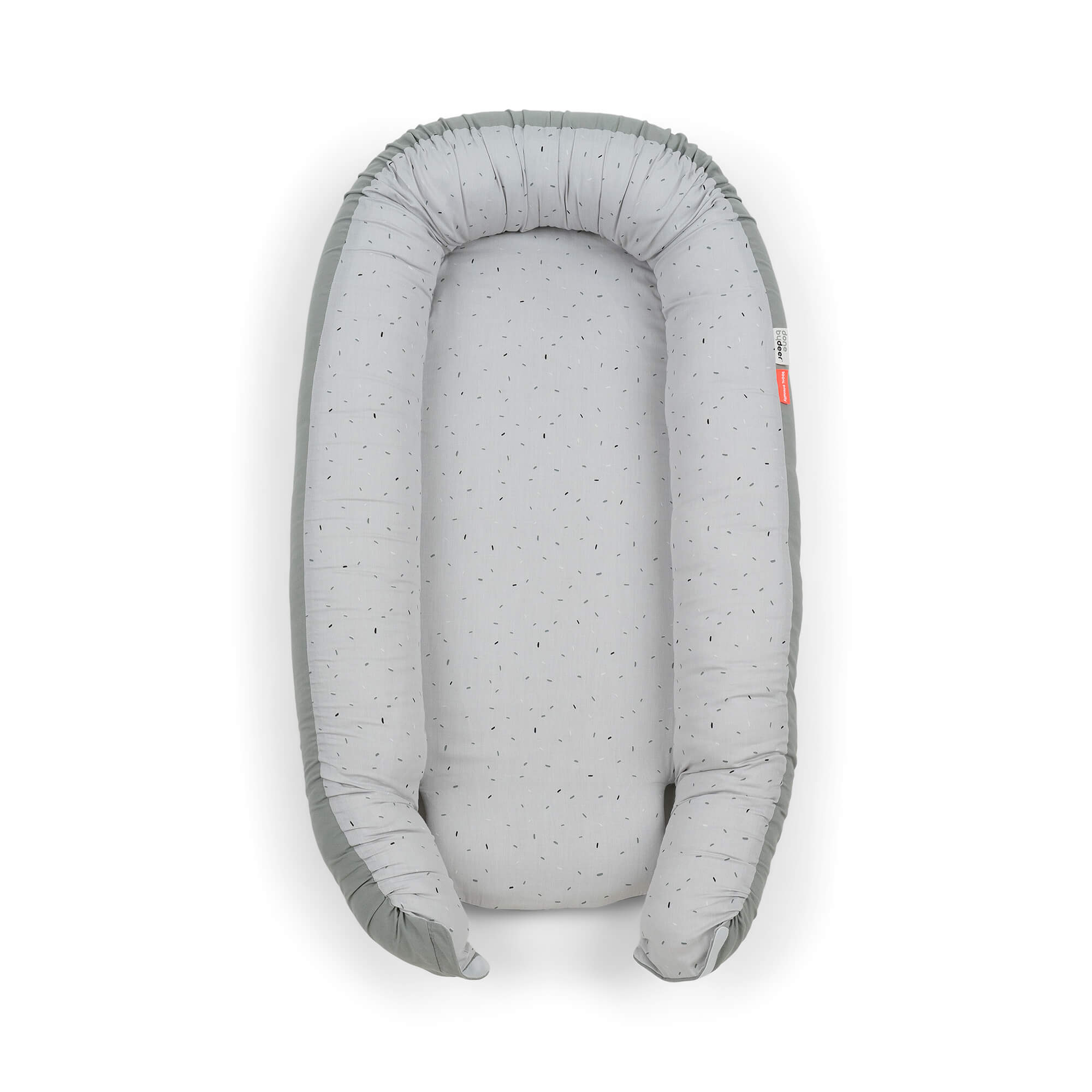 Cozy Nest Confetti fra Done by Deer er en myk, innbydende babynest som omslutter babyen og gir en trygg følelse akkurat som i magen. Den har festlige konfetti-prikker inni og ren, solid dus farge utenpå – et stilig og nøytralt design som passer perfekt inn i ethvert hjem.