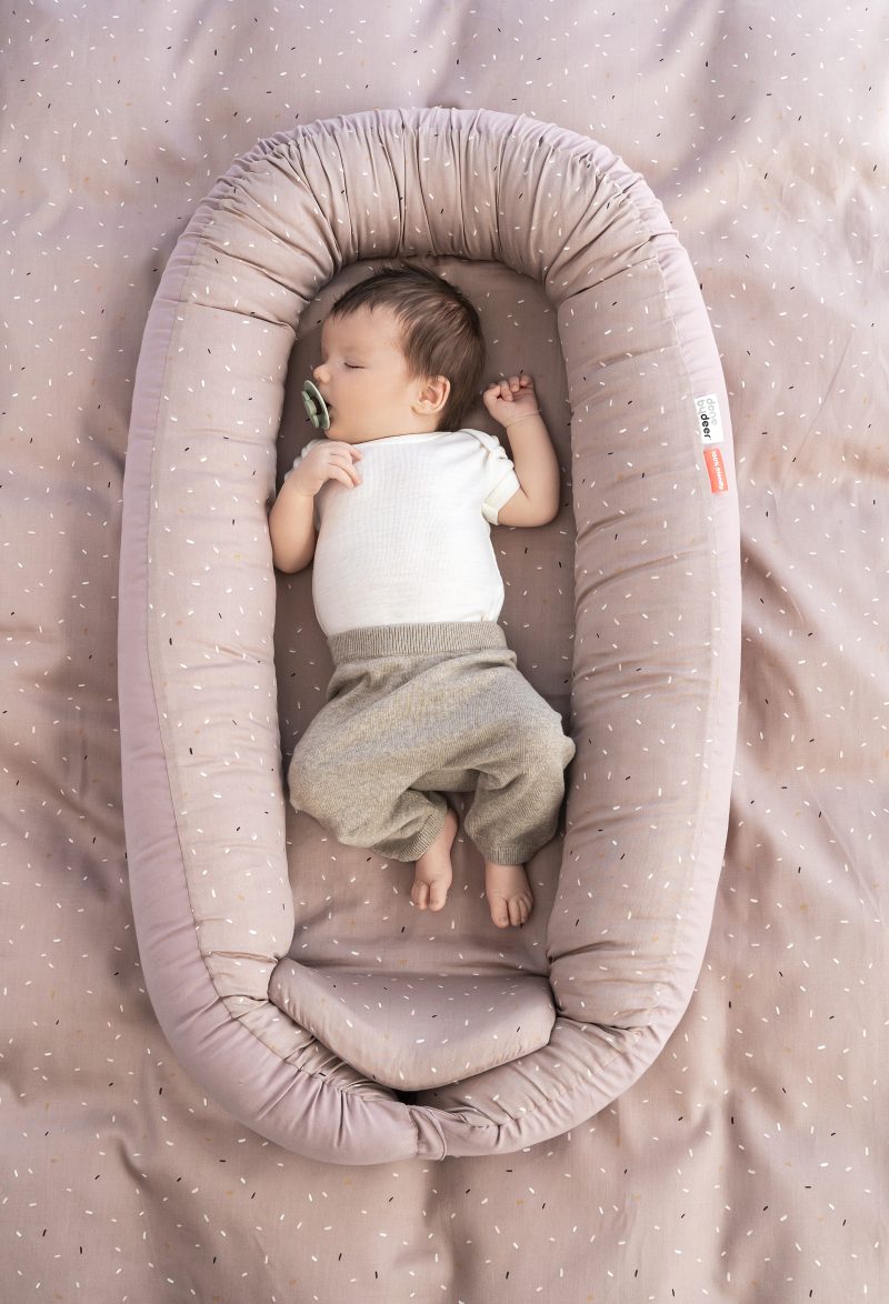 Cozy Nest Confetti fra Done by Deer er en myk, innbydende babynest som omslutter babyen og gir en trygg følelse akkurat som i magen. Den har festlige konfetti-prikker inni og ren, solid dus farge utenpå – et stilig og nøytralt design som passer perfekt inn i ethvert hjem.