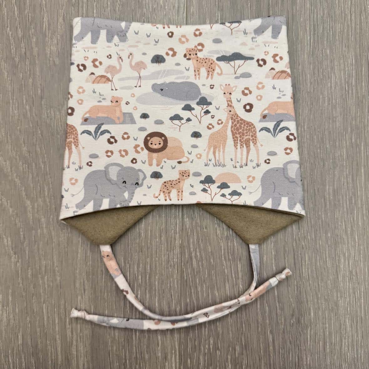 Unik og håndsydd lue med knytebånd fra Lille Apekatt. Luen er laget i bomull og fleece, og har god passform. Firkantluen legger seg godt ned i nakken som gjør at det gir ekstra beskyttelse mot vèr og vind.