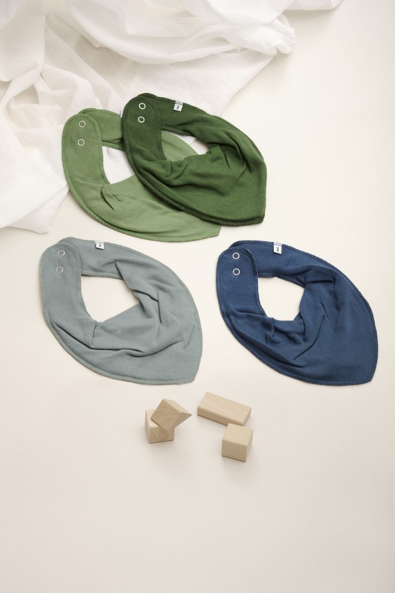 Myke siklesmekker i økologisk bomull. Siklesmekken består av tre lag; to lag stoff med et vanntett stoff i midten som hindrer væske å trekke gjennom. Babysmekken er behagelige for barnet og ha på. Smikken kan justeres med to praktiske trykknapper i nakken.